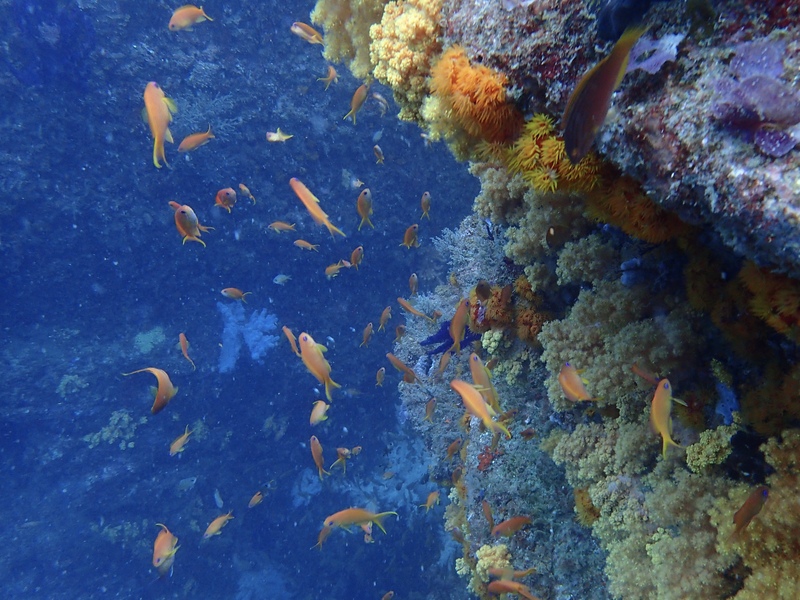 浅場に戻ると、色鮮やかなソフトコーラルとキンギョハナダイの群れ!